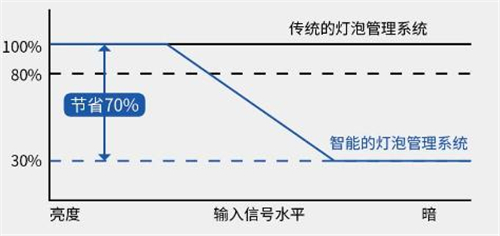 智能燈泡控制系統可在設定為圖像環保模式時,根據投影圖像的亮度調節輸出亮度,從而顯著降低燈泡功耗,最高可減少70%。無論是亮度、功耗,還是使用壽命、維護成本,理光高端商務投影機通過智能燈泡控制系統,給用戶提供了更舒服省心的使用體驗。