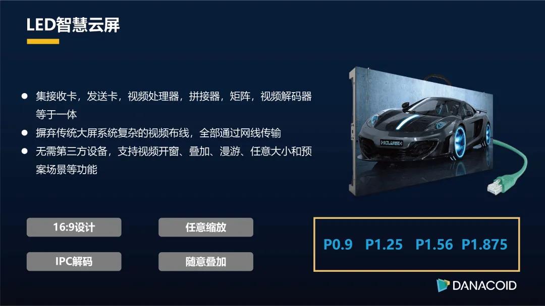 DANACOID大因LED智慧云屏畫質高清,細膩舒適,色彩鮮活,五雜色噪點, 有效減少摩爾紋;超薄輕量化設計,任意拼接,輕松超越8K;前后維護,設計簡約;電源系統(tǒng)雙備份設計,運行穩(wěn)定;信號無縫接入;云屏聯(lián)動,云桌面投射;海量監(jiān)控接入;云信息發(fā)布及鏡像;超高等級防水防塵。大因新一代COB屏擁有超高清分辨率;在顏色方面一致性好,視角大,光斑均勻,亮度較高,混色效果好;低熱阻,低故障率。