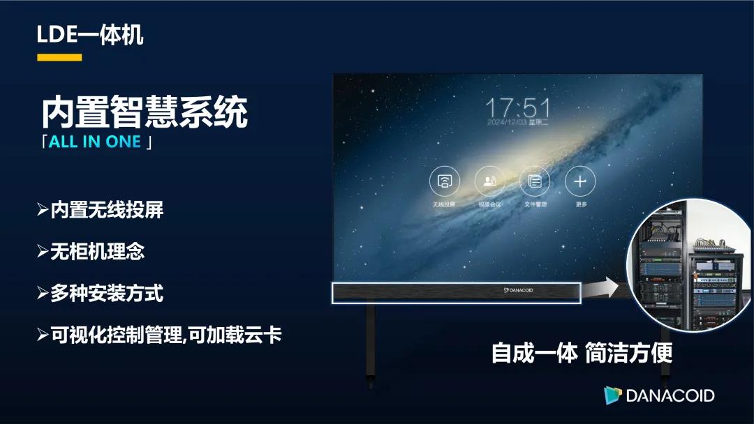 All in One LED智慧會議屏,設計超薄超輕,極簡的無外置柜機理念,占用空間小,維護簡單,避免傳統(tǒng)LED屏大量外置設備,使用方便簡潔,多種安裝方式。內(nèi)置智慧系統(tǒng),強大的客制化軟件-SD,家庭娛樂,信息共享,控制管理,多設備交互,視頻會議全網(wǎng)絡化IoT接入全支持。多屏互動,批注、分享隨心所欲。內(nèi)置無線投屏,支持電腦、手機、平板無線傳屏、分屏顯示,最多同時支持4臺設備畫面同時顯示,交互簡單高效。內(nèi)置視頻會議軟件,方便日常使用。可視化控制管理,系統(tǒng)擁有強大拼接處理能力,最大可支持16畫面分割,一切盡在指間掌握。