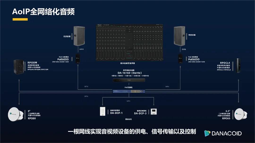 DynePro系統(tǒng)產(chǎn)品采用Dante數(shù)字音頻傳輸協(xié)議,結合自主研發(fā)的數(shù)字音頻處理器為核心向周邊拓展,將傳統(tǒng)的麥 克風、接口機、音箱轉變成在Dante傳輸?shù)漠a(chǎn)品,從而實現(xiàn)整個系統(tǒng)AoIP的布局。