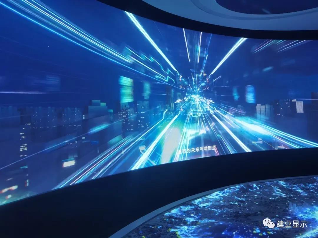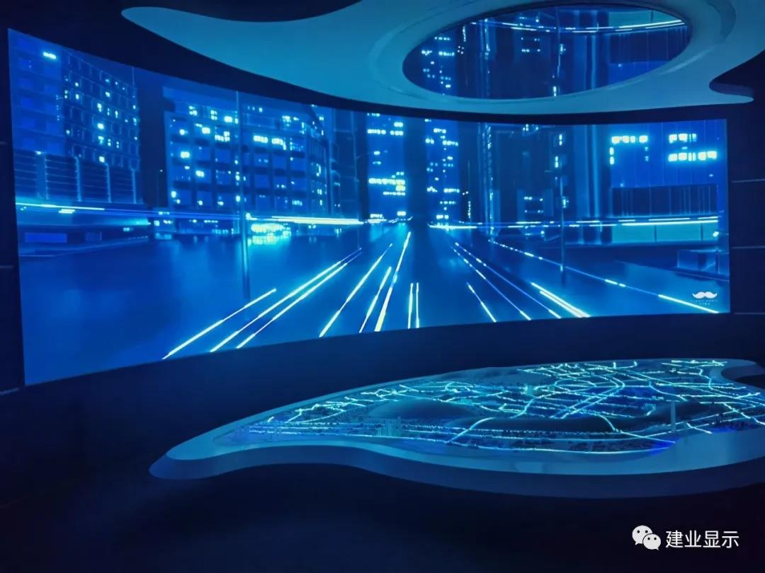 展廳中影音室弧幕使用2臺麗訊6500流明激光全高清投影機,呈現一幅寬8米高2.6米的視頻畫面,分辨率高達3428*1114Pix,電子沙盤則使用1臺麗訊5500流明激光全高清投影機,投影畫面寬5.2高3.25米,畫面精美,色彩表現豐富,簡述大浪片區不斷變革的發展歷程。