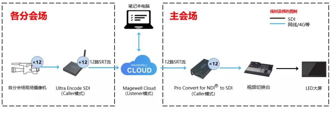 無錫、徐州和常州等每個分會場都部署了1臺美樂威Ultra Encode SDI編碼器用于連接現場影視攝像機拍攝的畫面,共有12臺編碼器。這些編碼器作為SRT Caller,通過4G無線網卡提供的網絡,將12路SRT流傳輸到Magewell Cloud;而Magewell Cloud作為SRT Listener再將這些SRT流分別轉發給南京主會場的12臺美樂威Pro Convert for NDI® to SDI解碼器。解碼后的SRT流輸出給切換臺,切換臺輸出PGM信號給到LED大屏顯示,供與會代表和群眾觀看。活動期間,主會場可清晰看到各分會場現場輸出的信號,畫面流暢穩定,音畫同步,整場活動受到了省體育局及參會單位的一致好評。