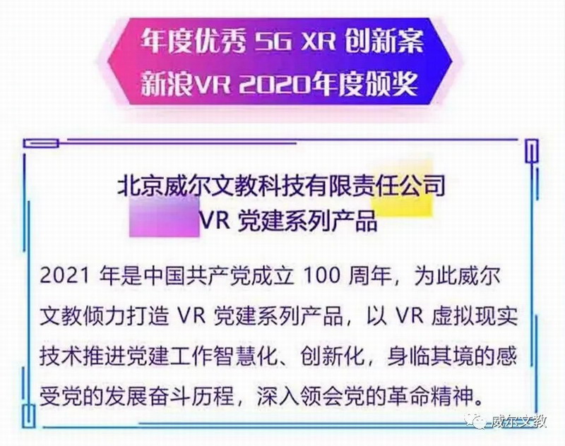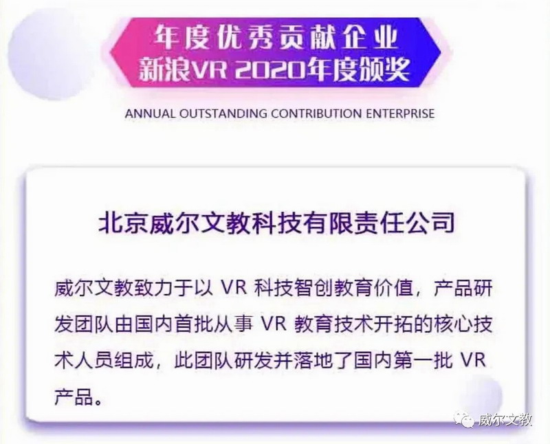 時至年關,威爾文教一舉斬獲“新浪VR 2020年度優秀貢獻企業”、“新浪VR 2020年度優秀5G XR創新案例”兩項殊榮。為2020年提交了令人滿意的答卷。