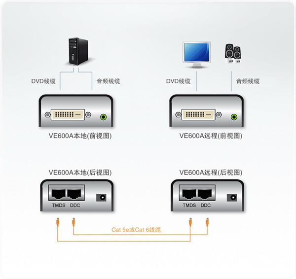 VE600A為一款具備音頻功能的DVI信號延長器,其可通過Cat 5e連接線延伸DVI顯示器與DVI信號來源設(shè)備達(dá)60m遠(yuǎn)。使用Cat 5e線纜可提供簡單且可靠的連接,相當(dāng)適合用于現(xiàn)在的大樓布局環(huán)境。VE600A更采用ATEN技術(shù),僅需一條Cat 5e線纜即可傳輸影像與音頻信號;若需傳送顯示器EDID信號,則需使用第二條Cat 5e線纜。通過立體聲音頻傳輸以及寬屏幕格式的支持,VE600A提供了遠(yuǎn)程設(shè)備清晰的影像與聲音質(zhì)量。