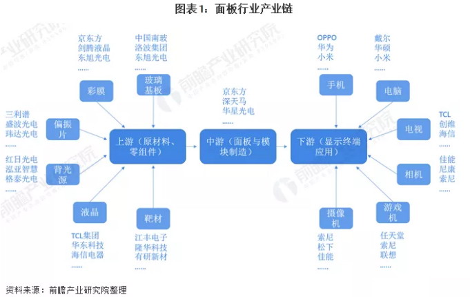從產業鏈來看,面板產業可以分為上游基礎材料、中游面板制造以及下游終端產品。其中,上游基礎材料包括:玻璃基板、彩膜、偏振片、液晶、靶材等;中游面板制造包括:列陣(Array)、成盒(Cell)、模組(Module);下游終端產品包括:電視、電腦、手機和其他消費類電子。