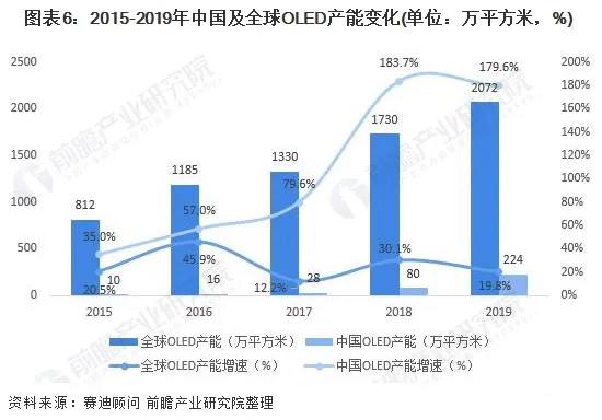 并且,隨著多條LCD G8.5/G8.6以及G10.5代線、OLED G6代產線產能加速釋放,我國LCD和OLED產能均保持高位增長,增速遙遙領先于全球面板產能增速,2018年我國LCD面板產能增速甚至達到了40.5%。2019年,我國LCD和OLED產能分別達到了11348萬平方米和224萬平方米,分別同比增長19.6%和19.8%。