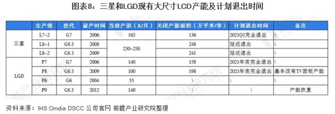 為了保證自家終端產品面板的正常供應,三星和LCD都宣布延遲關閉LCD生產線,目前LG的P7和P8產線明確延遲至2021年年底完全退出,三星的L7-2生產線計劃于2020年一季度關停,剩余的兩條L8-1和L8-2產線三星目前暫未給出明確的退出時點。