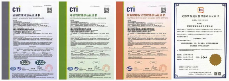 聯建光電打造了全面質量管理體系,圖為部分體系認證證書
