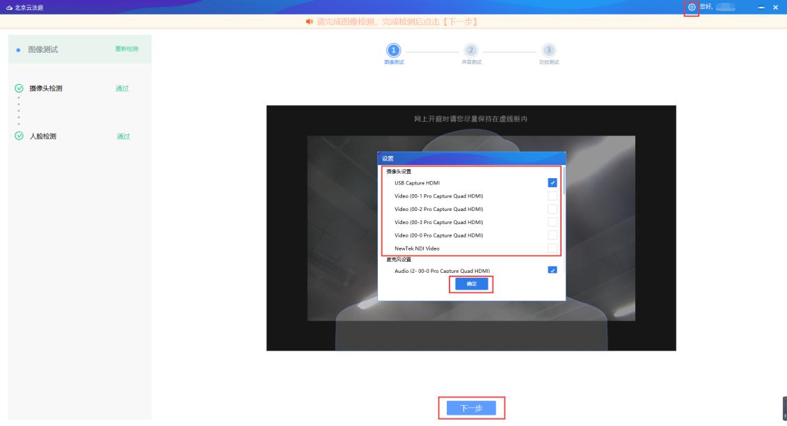 4、登錄“北京云法庭”軟件,點擊右上角“設置”,在彈出設置-攝像頭設置列表中可以看到美樂威USB Capture HDMI視頻采集棒和Pro Capture Quad HDMI四路視頻采集卡。“北京云法庭”軟件可以自動識別美樂威視頻采集設備并實現視頻采集。在此環(huán)節(jié)中,用戶可以完成圖像檢測、攝像頭檢測和人臉檢測。