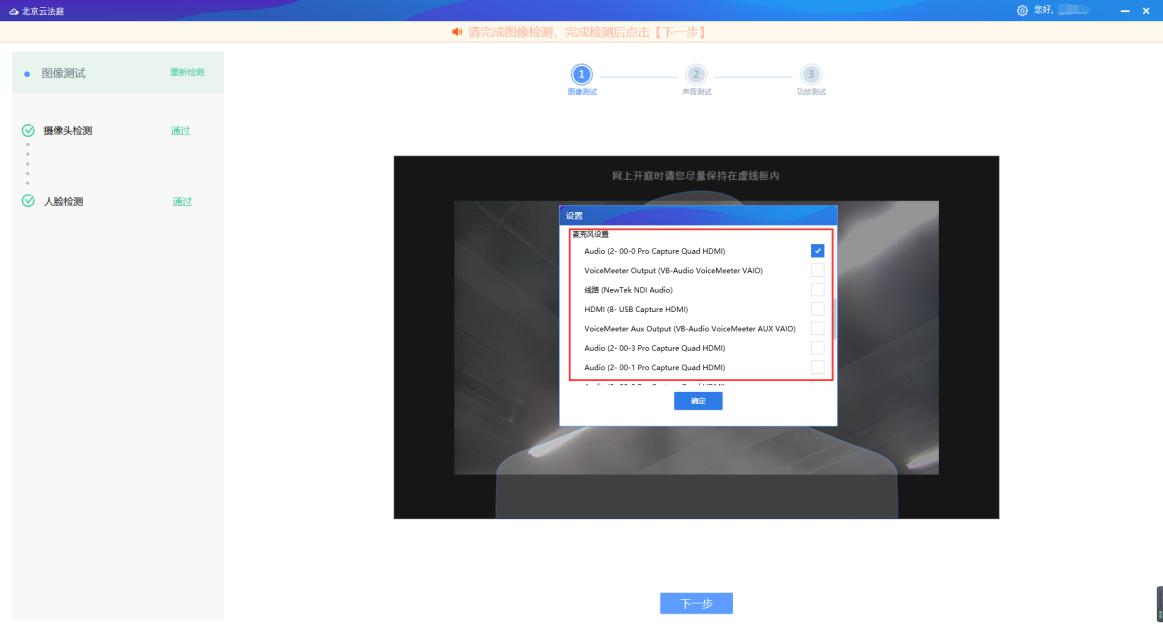 6、設置好視頻和音頻后,根據軟件提示進行麥克風和功放測試,測試通過后即可選擇對應案件在開庭日期進行線上庭審。