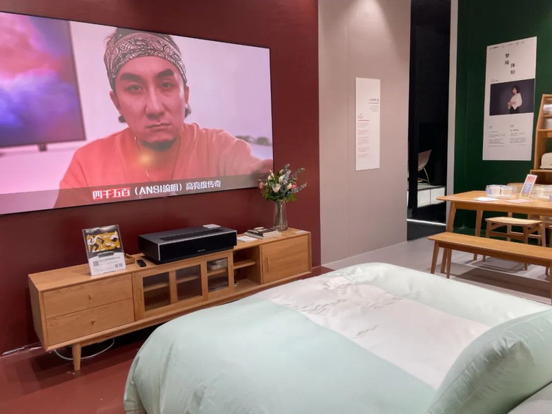 除了提供好玩的大屏,峰米科技也非常關(guān)心年輕人的睡眠以及精神世界。本次展會,峰米科技聯(lián)合南方寢飾,打造了一個愜意的臥室空間樣板間,特別為臥室空間搭配了峰米激光電視4K Max大屏,超短焦設(shè)計不占空間,100英寸超大屏幕壁掛,可作顯示屏亦可作壁畫裝飾(峰米還可設(shè)計柔性可卷屏幕隱藏式安裝),在活潑靜謐的環(huán)境下,能夠讓勞累了一天的身心得到放松,如果有興致還可以睡前看一場大電影,讓身體和靈魂都在滌蕩中修行。把臥室改造成電影院,一人是獨自享受,二人就是浪漫滿屋!