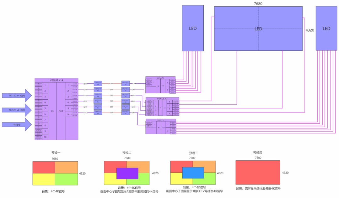 在啟動(dòng)儀式上,視誠(chéng)選用VENUS X系列作為視頻顯控處理器,采用兩組12G 的8K 信號(hào)輸送到X14,再通過4K光傳給到后端的拼接和顯示設(shè)備,對(duì)于8K信號(hào)無(wú)縫切換和畫中畫,結(jié)合AET的0.7 毫米的LED屏幕,實(shí)現(xiàn)了8K 信號(hào)的無(wú)縫拼接和展示,讓畫面色彩更飽滿,細(xì)節(jié)還原更真實(shí)。