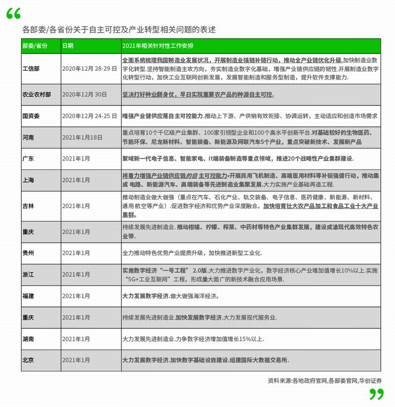 地方兩會(huì)總體延續(xù)了中央經(jīng)濟(jì)工作會(huì)議的主基調(diào),產(chǎn)業(yè)布局圍繞‚十四五‛規(guī)劃展開,加強(qiáng)了對(duì)“網(wǎng)絡(luò)強(qiáng)國、數(shù)字中國”的重視度,將推動(dòng)互聯(lián)網(wǎng)、大數(shù)據(jù)、人工智能等同各產(chǎn)業(yè)深度融合,推進(jìn)數(shù)字產(chǎn)業(yè)化和產(chǎn)業(yè)數(shù)字化,加大重要產(chǎn)品和關(guān)鍵核心技術(shù)攻關(guān)力度。