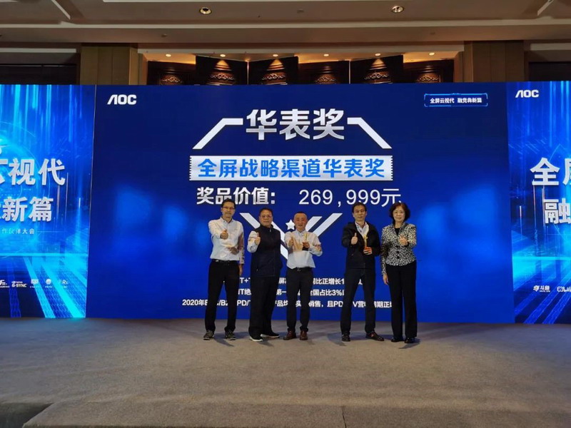 此外,針對2020年MNT、TV、PD全屏凈營業額同比正增長大于10%,MNT營收全國占比大于3%,B2C/B2B/TV/PD四類產品均有實際銷售,且PD+TV營收同期正增長,始終踐行品牌全屏戰略布局的渠道合作伙伴——北京匯德聯盟、成都華海達,特為他們頒發全屏戰略渠道華表獎!正因有他們在疫情期間不畏艱難,逆勢前行,才能讓AOC在形勢嚴峻的市場環境中,一次次能夠突破桎梏,克服困難而勇攀高峰!