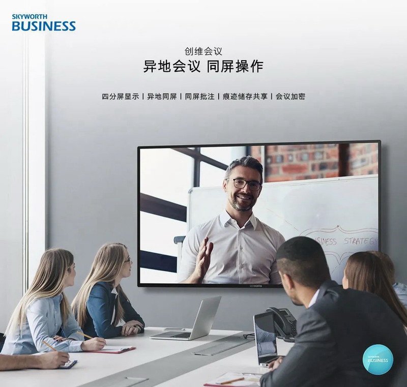 在企業的大型多人會議中,屏幕的合理分配尤為重要,既要保證會議內容的呈現效果,又要展現參會人員的整體精神風貌。創維商用智慧會議系統能夠通過分屏功能實現異地同屏,同時還支持電腦、手機、PAD等多設備同時參與會議,多方參會人員與會議內容同屏出現,讓大型多人異地會議也能實現與面對面溝通相當的效果。