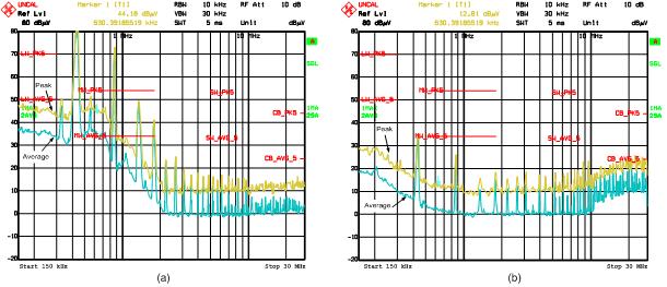 圖3:比較有源EMI濾波器處于禁用(a)和啟用(b)狀態(tài)下的濾波性能