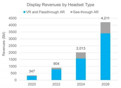DSCC表示,AR和VR市場將快速增長,2020年至2026年,用于AR和VR設備的顯示器銷售額將以52%的復合年增長率增長,銷售額將達42億美元(2020年為3.47億美元)。此預測不包括軍事應用。