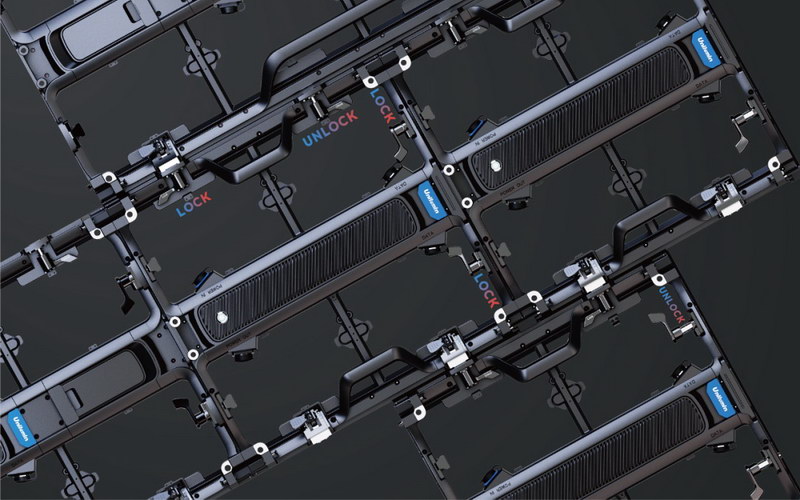 在用戶尤為關注的安裝與維護方面,洲明URMIII系列從客戶角度出發,采用一擊鎖定鎖扣、模組助推功能、箱體結構兼容地磚等創新設計,可真正實現單人安裝、拆卸、模組自動定位與便捷維護,幫助客戶大幅減少因頻繁拆裝產生的時間、人工與維護成本,讓運輸、安裝、使用、維護全過程更為便捷,為用戶提供極致產品體驗。