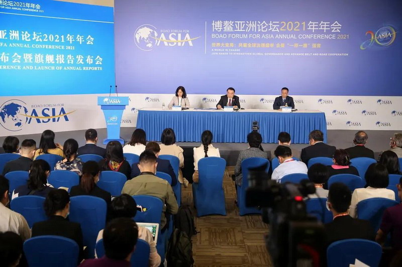 ▲博鰲亞洲論壇 2021 年年會新聞發布會暨旗艦報告發布會(新華社記者張麗蕓攝)