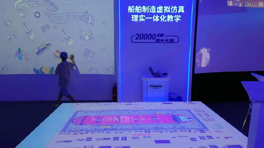 •展項說明:該展項使用2臺Panasonic 激光光源商教投影機進行畫面融合,打造超大畫面展示墻。體現Panasonic 激光光源商教投影機的輕便安裝、高亮畫質、性能穩定等特點。