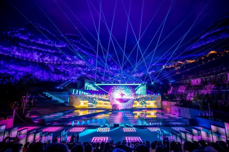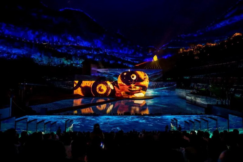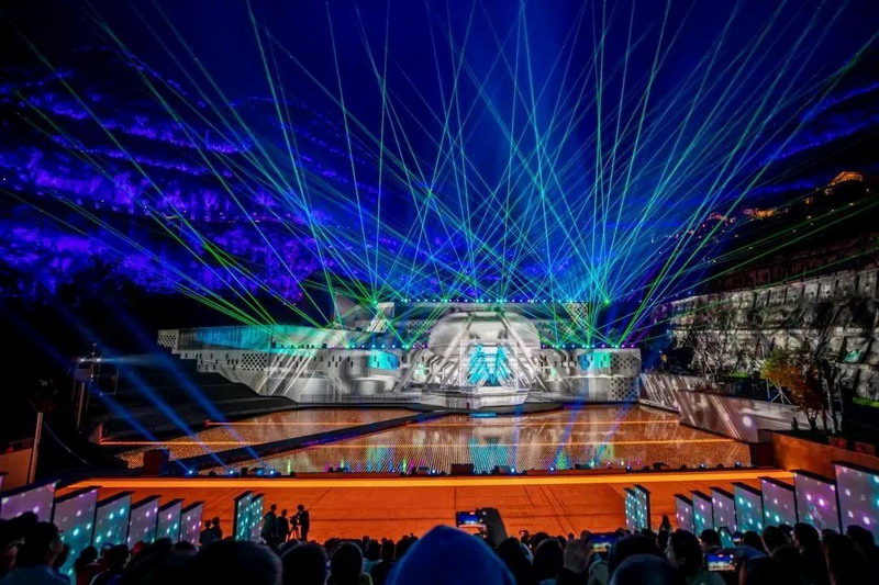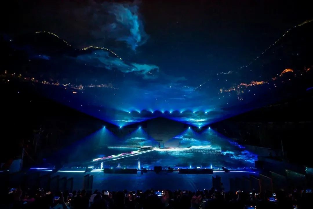 為了創造更生動的沉浸體驗,在本次光影秀中首次使用了觀眾席可升降晶膜屏設備,并融入燈光動態編程、崖壁激光成像、包裹式全景音響等前沿技術。通過編程集控同步調動,讓觀眾宛若置身其間,在導演精心營造的一幕幕繽紛幻境中酣暢神游。