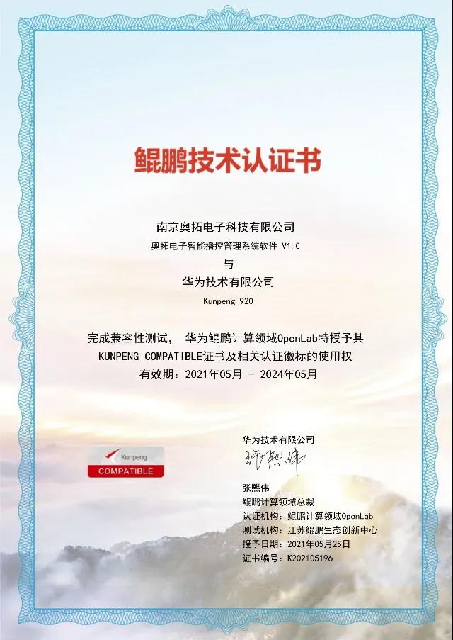 近日,奧拓電子智能播控管理系統以高效穩定的運行結果和優秀的兼容性,通過了華為Kunpeng 920芯片和華為TaiShan200系列物理機的兼容性測試,獲得了兩份華為鯤鵬技術認證書。自此,奧拓電子智能播控管理系統能夠流暢地運行在以鯤鵬芯片為核心的服務器上,可以為金融、通訊、廣告、交通、體育及展會、文旅等行業客戶打造安全可信的國產化視訊解決