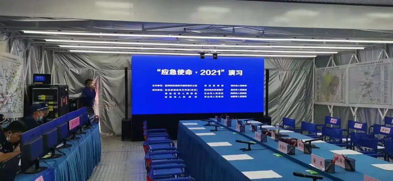 在應急救援現場要實現信息暢聯、全面統籌,可視化指揮調度就顯得尤為重要。為了后方救援工作的高效快速開展,在演習現場的國家級指揮方艙指揮室內,采用了GQY視訊提供的快速拆裝架構的LED屏。