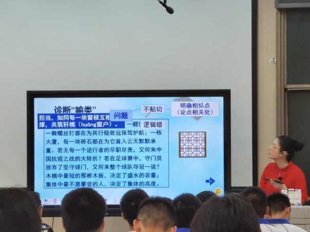 在課中,肖老師通過展示學生作品中的論證問題,結(jié)合“新木桶原理四法則”對定義進行了生動的講解和剖析,讓學生們形象地理解喻證法。
