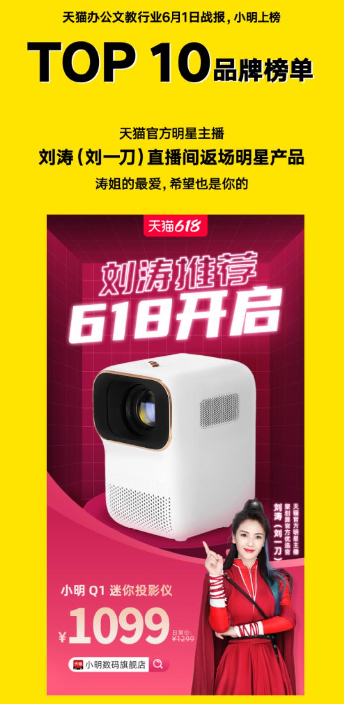 此外,小明 Q1 迷你投影儀還登陸天貓官方明星主播、聚劃算官方優選官劉濤“劉一刀”直播間,以出色性能和驚喜好價,成為直播間返場明星產品,并入選天貓辦公文教行業品牌TOP 10。小明 Q1 迷你投影儀的完美首秀,盡顯千元投影機皇的風采。