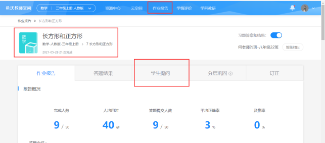 ④單元測試,分層練習:老師了解學生較薄弱學科知識點后,在教師空間挑選同步卷分發布置,或是將校內資源同步試卷通過自制答題卡讓學生進行答題檢測。在學生完成作答后,老師通過作業報告查看全班檢測數據,如每道題正確率、人均用時長及學生個人詳情等。同時老師可基于數據分析進行智能組卷,將不同難度的習題卷分層推送給各層次學生,讓每個同學都可以在原有的基礎上練習提升。