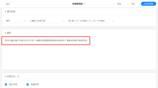 授課過程中,老師可將本節課的重難知識點或典型題目通過知識膠囊進行錄制,課后引導學生專項學習鞏固。同時老師可在教師空間資源中心內篩選習題,并標記為優題,生成班級優題集,學生通過個人平板內的班級優題集或自動生成的錯題集進行自主復習,從而提升復習效率。在考前階段,老師可使用發表觀點功能,讓學生發表考前想對自己說的話,彼此鼓勵放松;針對害羞內向的學生,老師可以布置解答題,讓學生以文字的形式說出自己的壓力,從而了解學生現有狀態并進行針對性心理疏導。