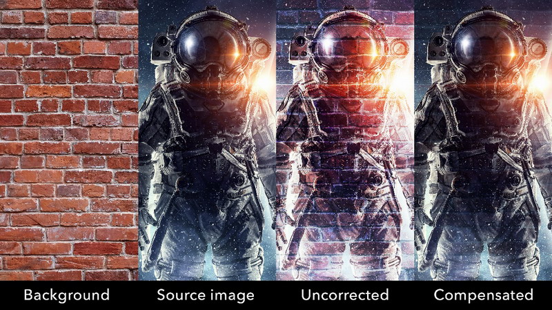 如果投影表面有污跡、褪色或不均勻,這些視覺上的缺陷就可能影響投影高品質(zhì)圖像。Mystique 新推出的背景補償功能會使用彩色攝像頭來偵測出屏幕或投影表面上對比度的嚴重差異,并對表面的異常做出自動調(diào)整,從而呈現(xiàn)出更加均勻的投影圖像,讓您的工作重點放在投影內(nèi)容上,而不用憂心背景的品質(zhì)。