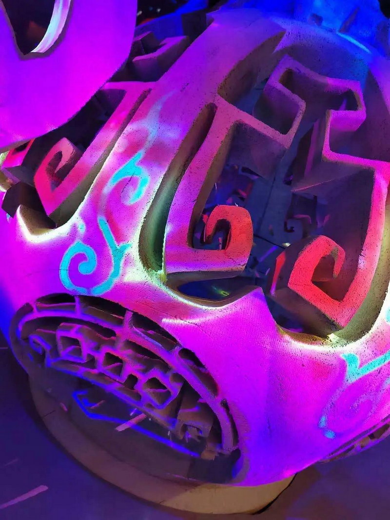 “夜貓子集”光影秀一共采用了17臺(tái)超高清雙色激光工程投影機(jī),其中墻面6臺(tái)(顯示尺寸:25.6m*2.6m,分辨率:21000*2160)、地面8臺(tái)(顯示尺寸:9.6m*7.6m,分辨率:9216*5184)、妖魂塔3臺(tái)(顯示尺寸:3.2m*1.9m,分辨率:3456*1200),整個(gè)方案光路設(shè)計(jì)和融合技術(shù)十分復(fù)雜,通過多次模擬搭建、實(shí)物1:1預(yù)搭建的方式規(guī)避了多項(xiàng)干涉和融合問題,才能實(shí)現(xiàn)最終完美效果。