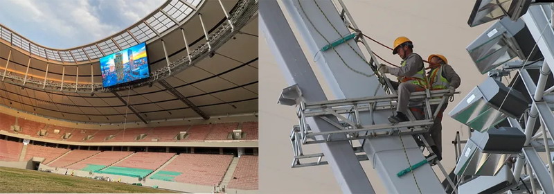 為克服這個難題并保證建筑和施工的安全,工程團隊多次前往現場勘察與實地測量,由于場館的特殊性采用懸掛固定的安裝方式,并反復精確計算顯示屏的位置、角度、高度及各個定位點,除此以外,顯示屏結架構、結構受力分析等與穩定與安全相關的因素都需要一一分析。