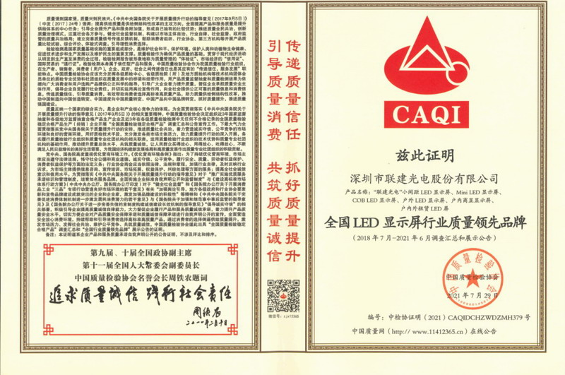聯建光電不僅有高于行業的檢驗標準、專業的檢驗流程,還有完備的質量管理體系。公司連續多年獲得全國質量穩定檢測合格產品認證,全國LED顯示屏行業質量領先品牌榮譽,作為業內首批通過國軍標質量管理體系認證的企業,擁有軍工級品質。未來聯建光電也將繼續堅持品質,守好企業的生命線,讓中國智造繼續領先全球!