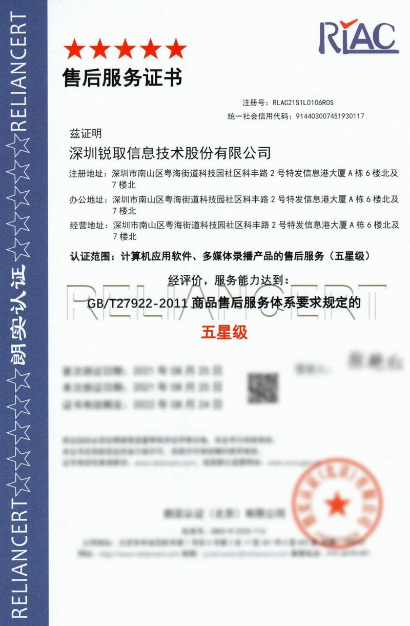 銳取一直以為師生提供用心、貼心、暖心的優質服務為己任,深度挖掘校園信息化建設的痛點難點,聆聽每一位學校工作者的心聲和需求,不斷提升團隊服務質量,竭盡所能為學校提供周到的支撐服務。高質量的服務,不僅深獲師生們的肯定,同時在經過層層評審后,榮獲商品售后服務評價體系的五星級認證!銳取將繼續以用戶為己任,保障用戶的每一分需求,提供點滴用心服務。