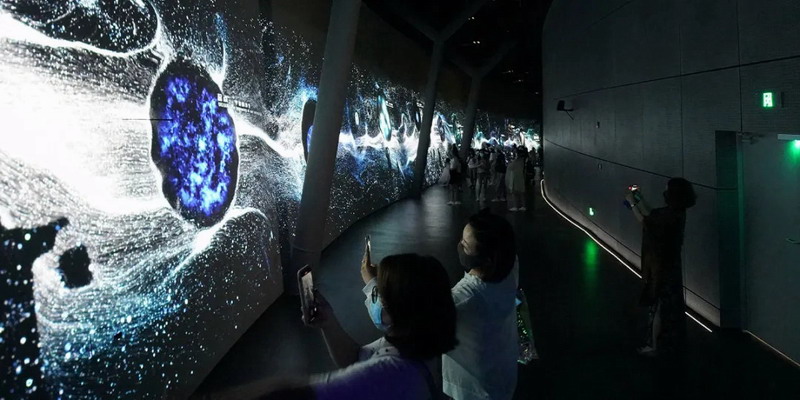 離開“家園”前往“宇宙”,漫步長達 60 米的“星際穿越”長廊。巨型幕墻的互動投影由 10 臺Christie DWU1075-GS 激光投影機呈現。步入其中與星塵作伴,邂逅未知的奇觀。在長河終點,遇見宇宙微波背景輻射。
