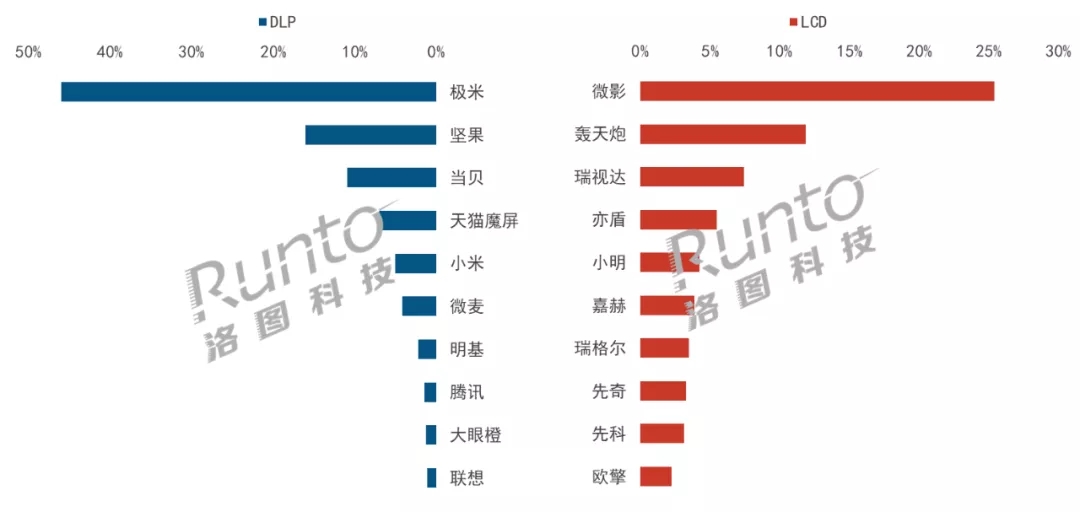LCD市場TOP3品牌為微影、轟天炮、瑞視達,合計份額達到44.7%,較上月增長5.7個百分點。微影排名第一,銷量同環(huán)比均增長40%以上;小明瞄準年輕群體,在供應鏈上實現(xiàn)國產(chǎn)化替代,產(chǎn)品主打高清便攜,定價千元檔,上市兩個月均進入前五。