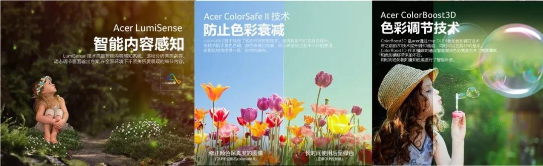 得益于Acer ColorSafe II 第二代色彩保真技術,避免長時間使用后色彩失衡,保證色彩真實亮麗,體現DLP技術的優勢。同時,Acer LumiSense智能感光技術,搭載智能內容感知系統,逐幀分析畫面內容,動態調節畫面輸出方案,在全黑環境下不丟失所要展現的細節內容。在播放3D影片時,Acer ColorBoost3D躍彩技術通過智能增強色彩亮度彌補亮度降低和色彩便宜是帶來的不足,同時對色彩飽和度和色溫進行了智能補償。