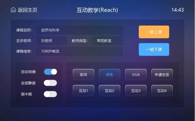 不僅于此,云端主講教室中,銳取錄播系統(tǒng)聯(lián)結教務部門導入的課表,自動開啟課堂的錄制、直播。主講老師的講臺全景、特寫、課件和學生全景,搭載著銳取云端學校平臺,跨越校際邊界,突破時空界限,高清呈現(xiàn)于主講和聽講教室的大屏中,為學生帶來精彩課程體驗,滿足區(qū)域級、跨校級、集團化的辦學需求。