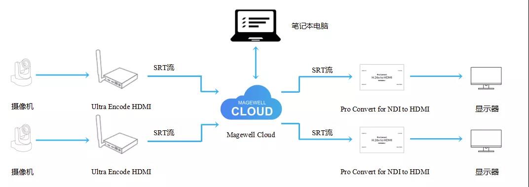 使用美樂威Ultra Encode HDMI和Pro Convert NDI to HDMI搭建多路SRT流傳輸方案,并將它們注冊到Magewell Cloud,可參考博文《如何將美樂威IP設備注冊到Magewell Cloud》。具體設備連接如下圖所示。
