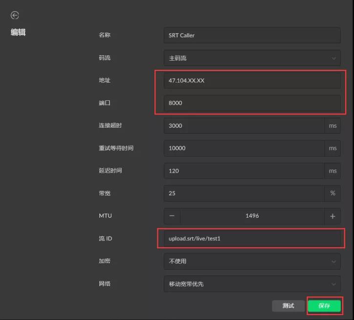 在彈出的頁面中填寫Magwell Cloud固定公網IP,端口號(如圖中的8000)和流ID(格式為“上傳域名稱/live/自定義名稱”,如圖中的upload.srt/live/test1,“test1”為自定義名稱),點擊“保存”。同理,登錄另一臺編碼盒Web GUI,重復上述步驟,流ID填寫為“upload.srt/live/test2”。