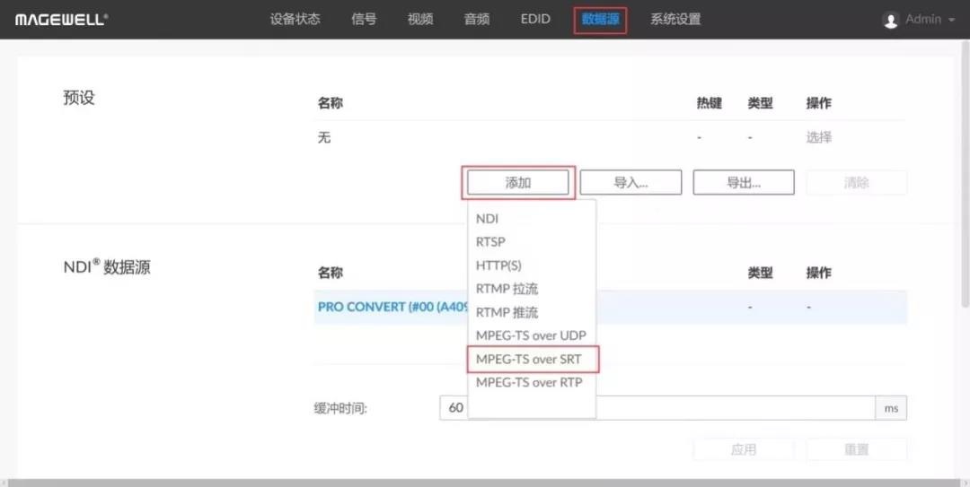 5. 進入一臺解碼器“數據源”頁簽,在“預設”欄,點擊“添加”,選擇“MPEG-TS over SRT”。