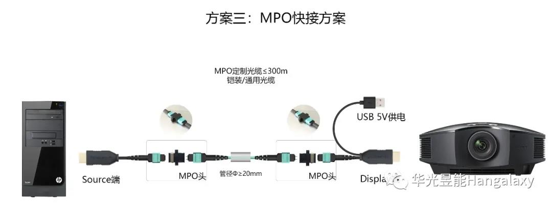 隨著關鍵零配件成本的下降,目前MPO的價格較為親民,華光昱能Hangalaxy適時推出改良版的HDMI+MPO產品工藝和材質的同時,提高了MPO方案的應用,去年正式推出了HDMI/DVI/DP/USB3.0等接口的有源光纖線+MPO連接方式,讓工程布線又多了一項確實可行的解決方案。