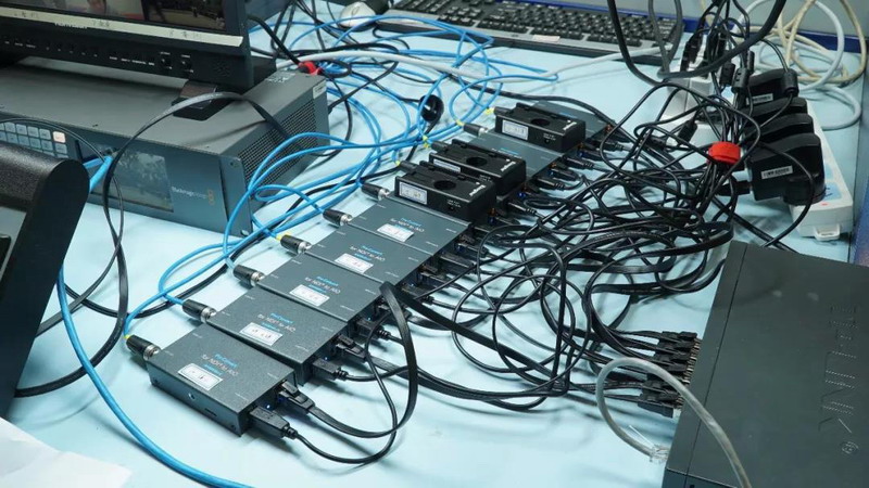 該活動由江蘇省廣播電視總臺項目團隊負責會場的音視頻方案搭建、實施和操作,通過互聯網將10個分會場音視頻信號傳輸到主會場。考慮到各分會場項目人員操作的簡易性,項目團隊負責人一直在尋找簡單可靠地音視頻傳輸方案。美樂威技術團隊向負責人推薦使用美樂威Ultra Encode系列編碼器和Pro Convert系列解碼器,并借助Magewell Cloud軟件,實現現場20臺編解碼設備集中控制和主分會場之間1080i50音視頻信號的SRT跨互聯網傳輸。此外美樂威技術團隊還使用美樂威USB Capture系列采集棒實時采集現場PGM信號,通過騰訊會議的方式給各分會場分享彩排過程和比賽現場實況。