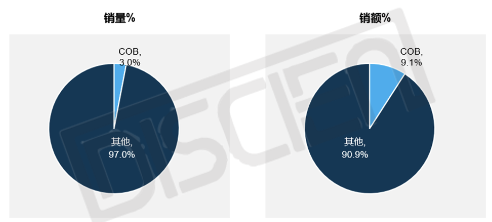 分銷量銷額看,上半年COB占小間距銷售額的9.1%,但銷售量占比僅在3%,一方面由于同等間距規(guī)格下COB產品價格更高,且COB多以行業(yè)/工程型項目為主,經(jīng)銷渠道出貨占比較低;另一方面COB市場的間距微縮化進程更快,更小間距需求度更高。