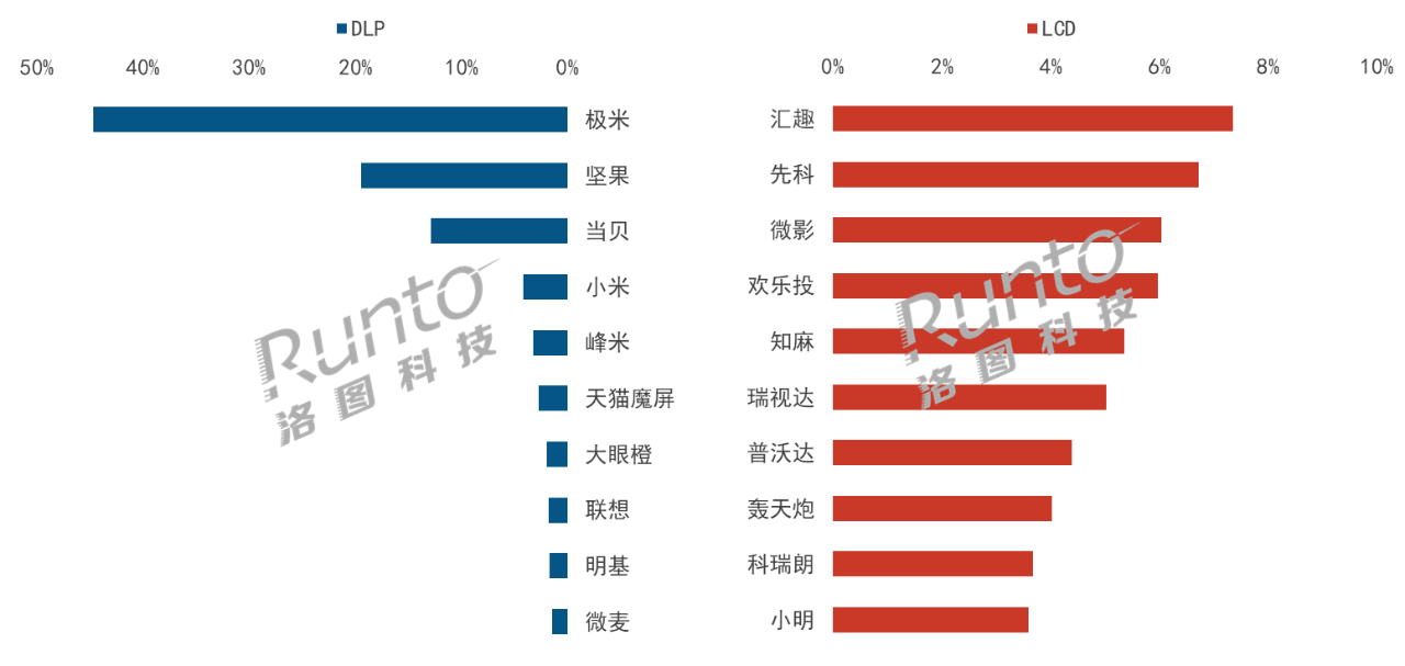 1LCD市場大洗牌,TOP10品牌排名較去年同期全部發生變化。匯趣憑借較低的產品價格躍居至首位;先科通過豐富的SKU布局排名第二;微影下滑至第三;知麻新品Z1系列表現良好,升至第五位。