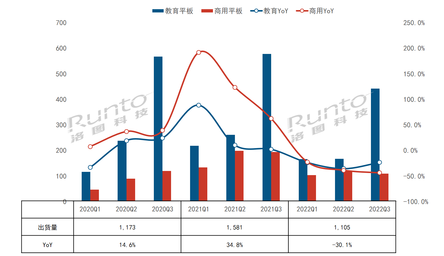 RUNTO將交互平板根據(jù)應(yīng)用場(chǎng)景分為教育交互平板(E-IB,Educational Interactive Board)和商用交互平板(C-IB,Corporate Interactive Board)。 第三季度,教育平板出貨44.2萬(wàn)臺(tái),同比下降23.6%;商用平板出貨10.8萬(wàn)臺(tái),同比下降44.0%。