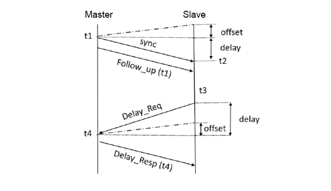 兩臺設備中,一臺設備作為主時鐘(Master),一臺設備作為從時鐘(Slave),利用延時響應機制相互發送同步、跟隨、延遲請求和延遲請求響應報文,來計算得出兩者時鐘偏差(offset)和網絡延時(delay),之后通過修正本地時鐘進行時間同步。整個過程如下圖所示: