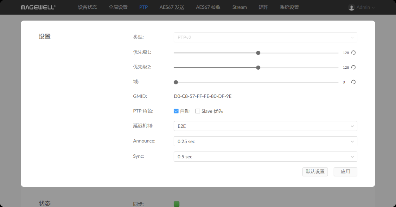 登錄進入Pro Convert AES67的WebUI,進入“PTP”頁簽,可以設置以下參數: